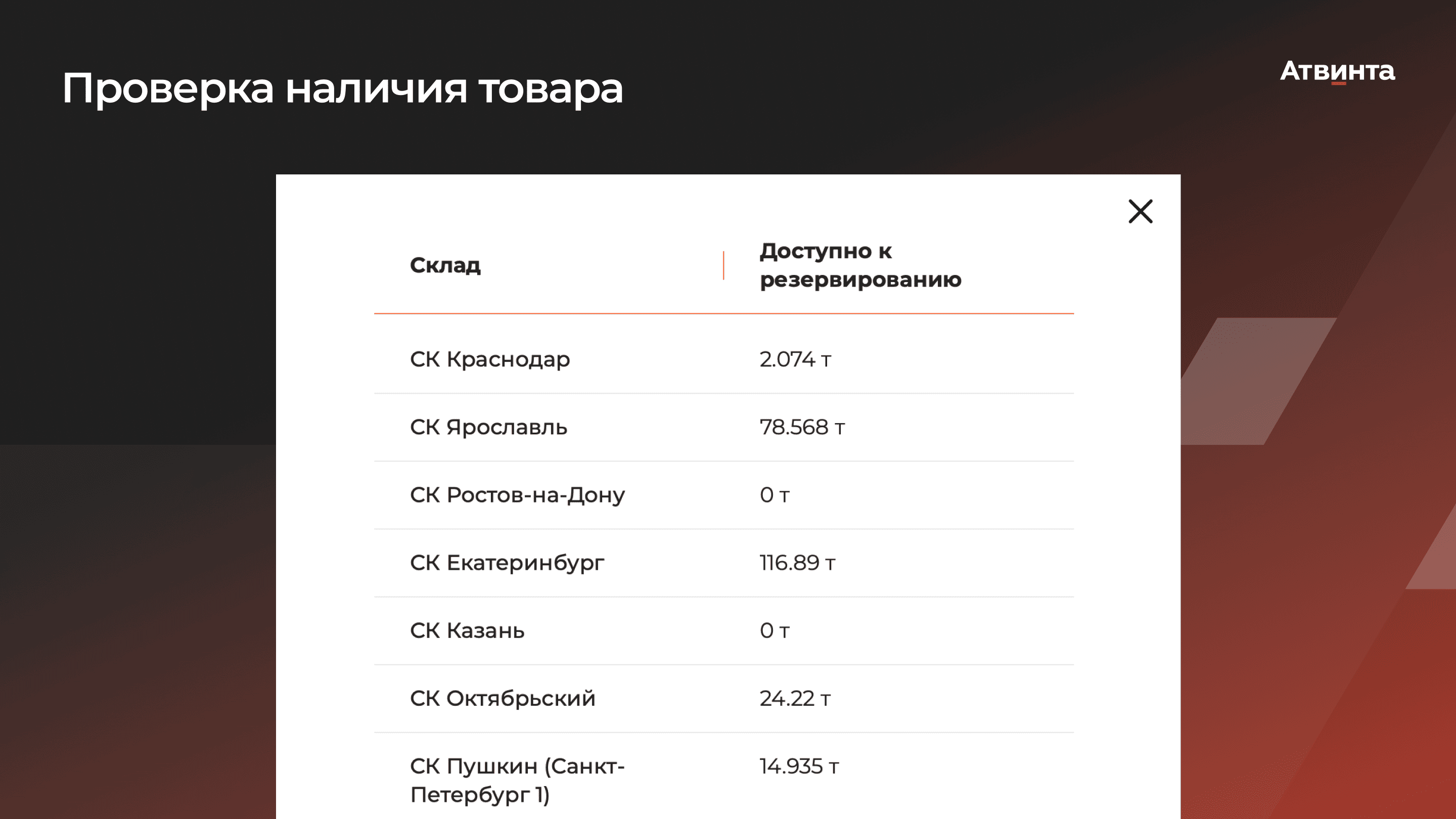 Показываем актуальные остатки по складам. В кабинете можно проверить наличие на складах и добавить товары в резерв. Решения принимаются по фактическим данным и в одной системе.