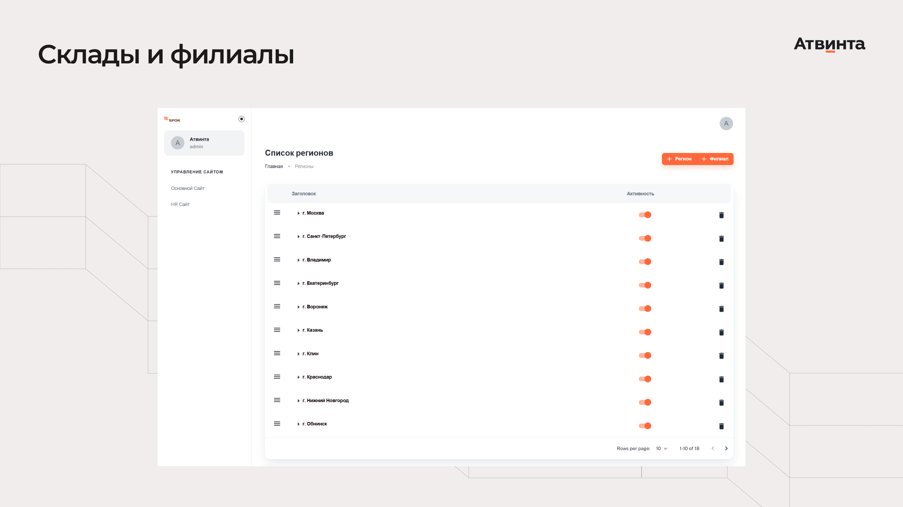 Адреса, телефоны и филиалы редактируются в админпанели. Менеджер может быстро добавить новый склад без участия разработчиков.