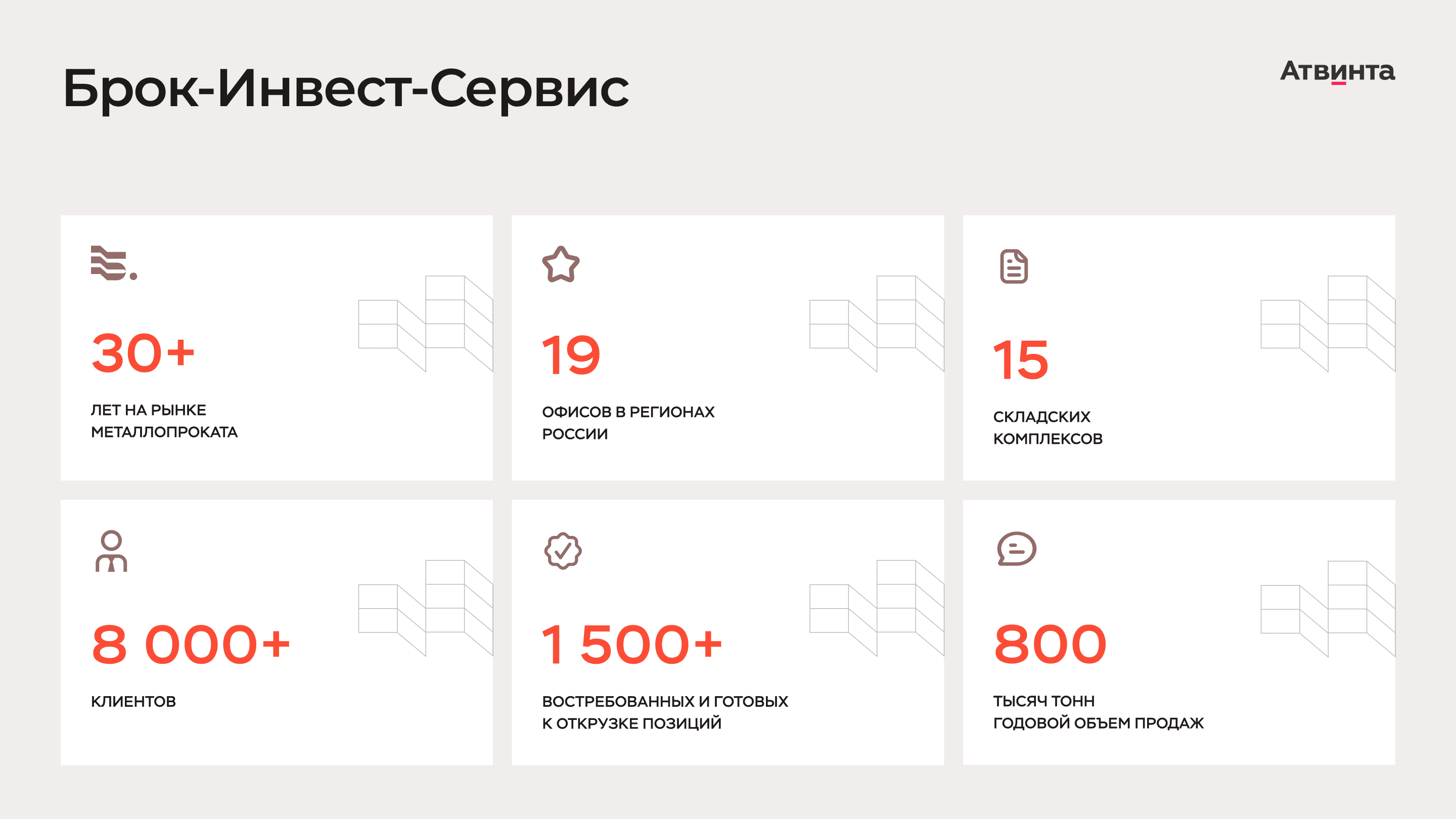 «Брок-Инвест-Сервис» — один из топ-10 металлотрейдеров России. Продукция компании применяется в строительстве, прокладке коммуникаций в жилых и коммерческих зданиях, а также при создании масштабных инфраструктурных объектов: Московский метрополитен, аэропорт Шереметьево и Крымский мост.