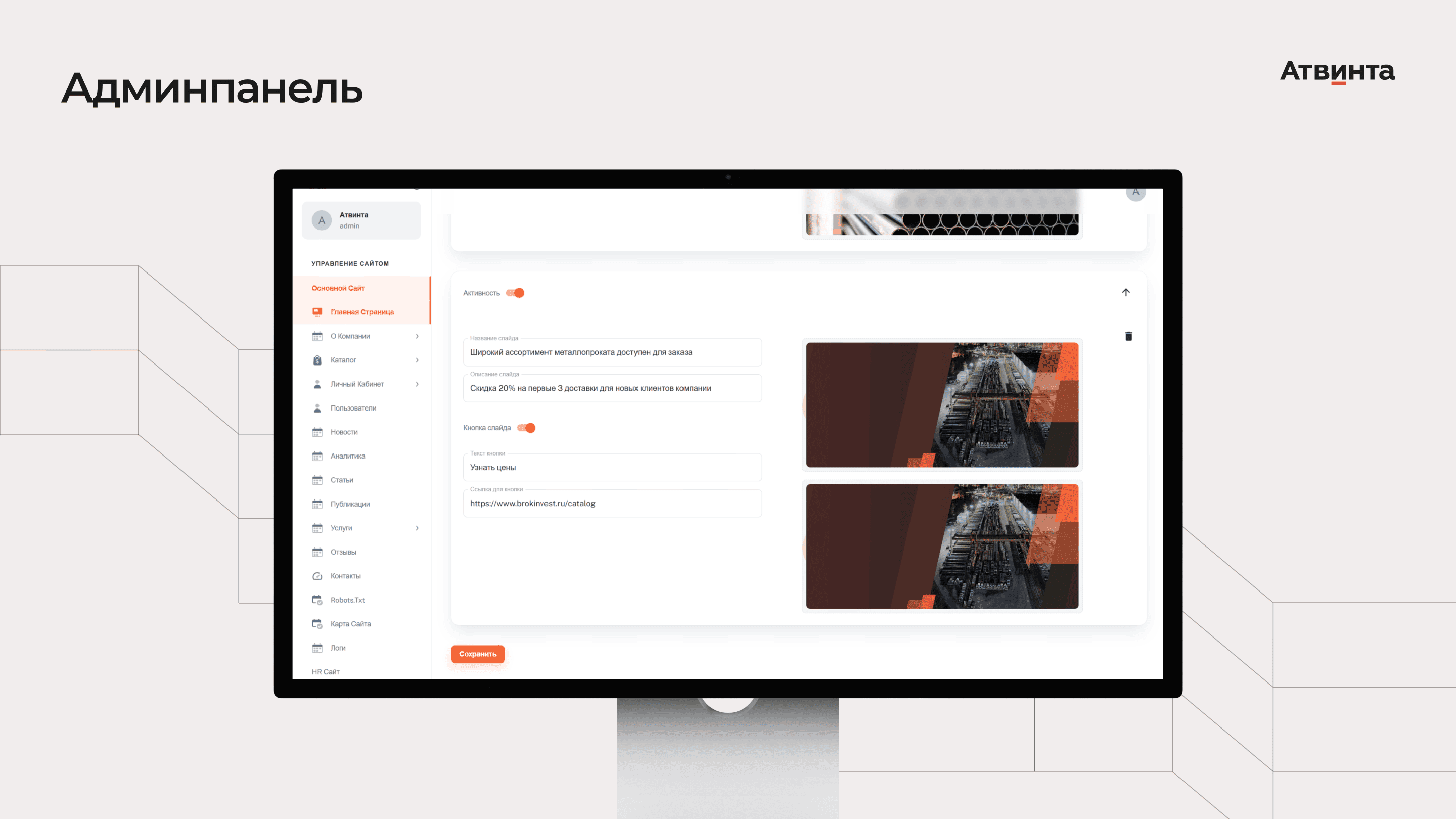 Главный баннер теперь можно настроить в админпанели: добавить кнопку, изменить текст и выбрать порядок слайдов. Настройки закрывают задачи маркетинга — можно запускать акции и предложения в пару кликов.