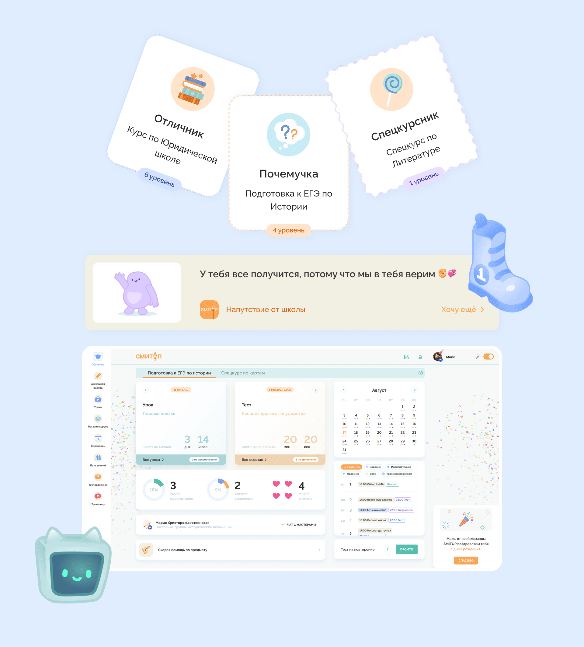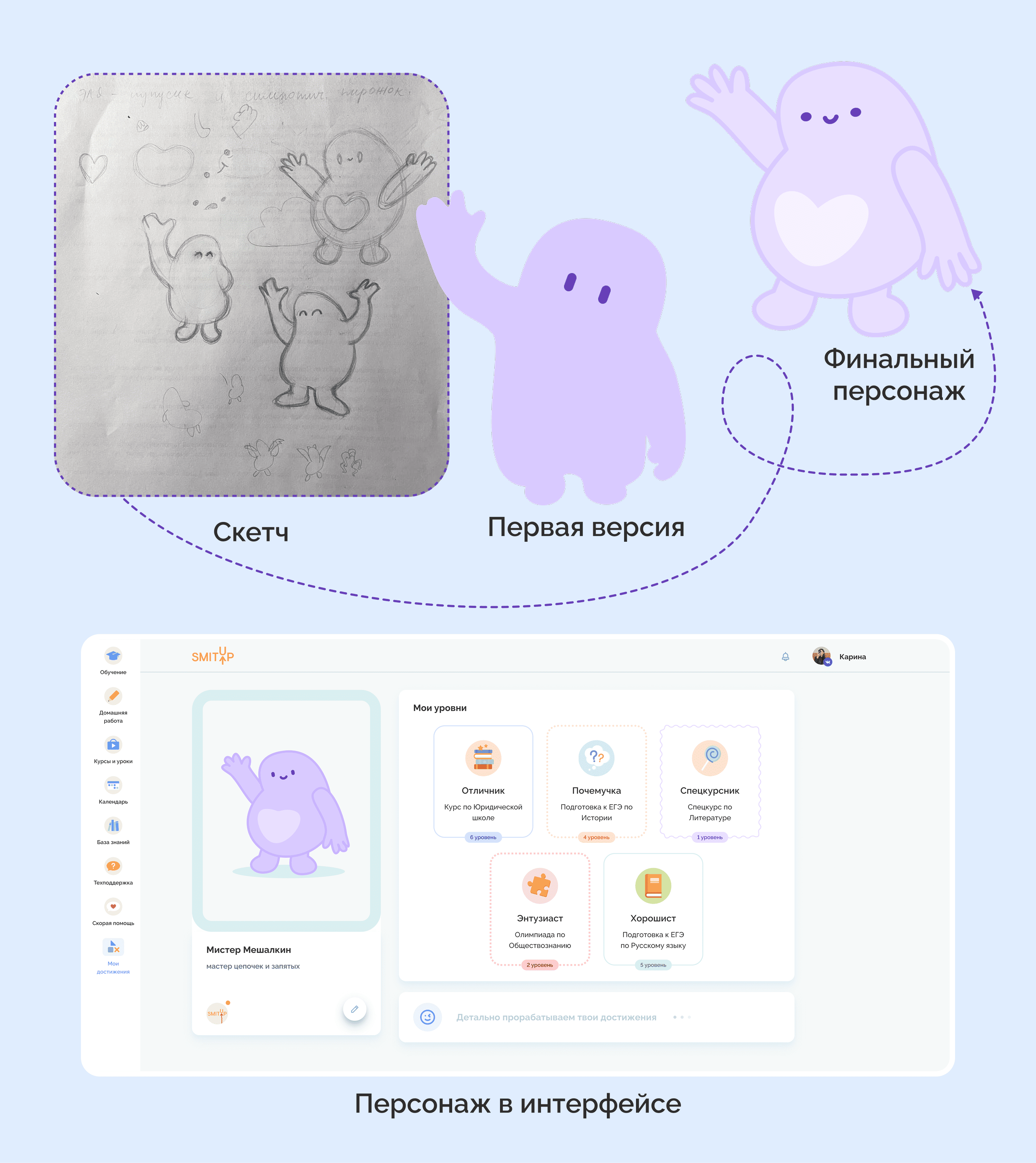 На образовательной платформе СМИТАП мы добавили дружелюбного персонажа, который выступает в роли помощника для учеников сервиса.
