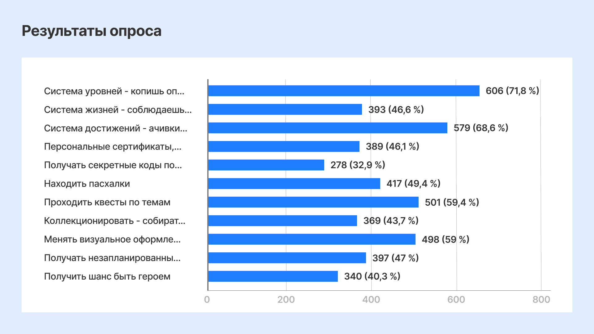 Наша команда аналитиков собрала информацию по функциям, которые нравятся учащимся, проанализировала результаты опроса и выделила основные инструменты. Например, системы уровней и достижений наиболее популярны среди школьников — 606 и 579 голосов. Затем идут квесты, персонализированный дизайн интерфейса, поиск пасхалок, начисление «жизней» и получение сертификатов.