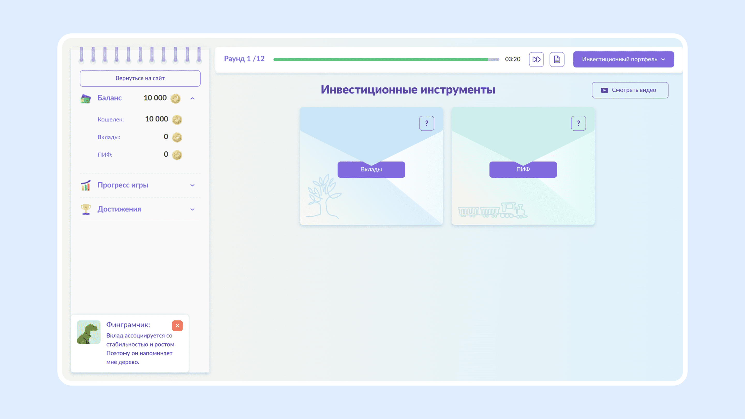 Для регионального портала финансовой грамотности мы разработали симулятор инвестиционного рынка. Он помогает объяснить подросткам и взрослым, как работают вклады, акции и облигации.