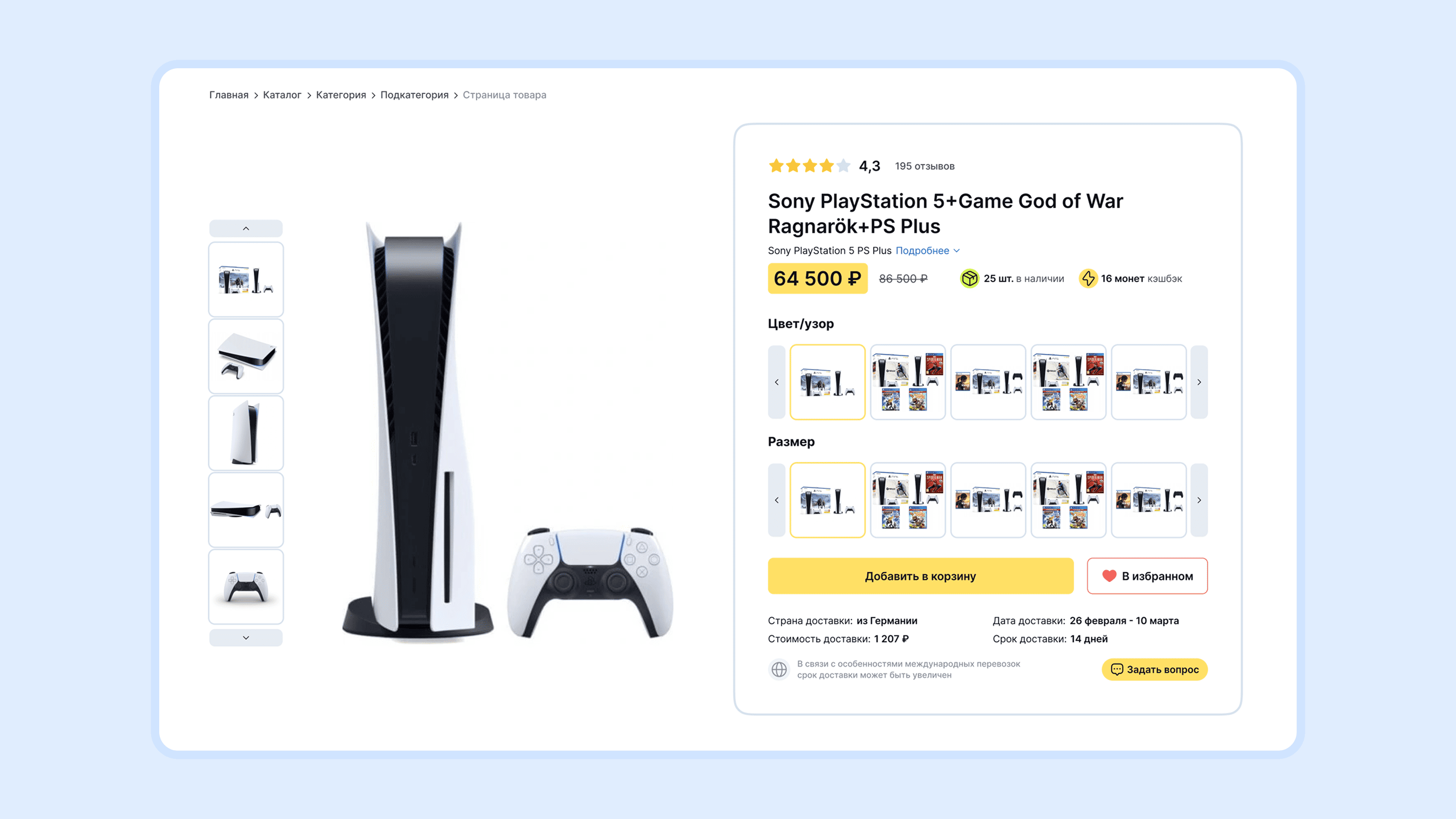 - Варианты товара. При переключении цвета, размера или комплектации обновляйте стоимость продукта, наличие и фото внутри одной страницы. Так можно избежать дублей и сохранить точность данных для поиска.