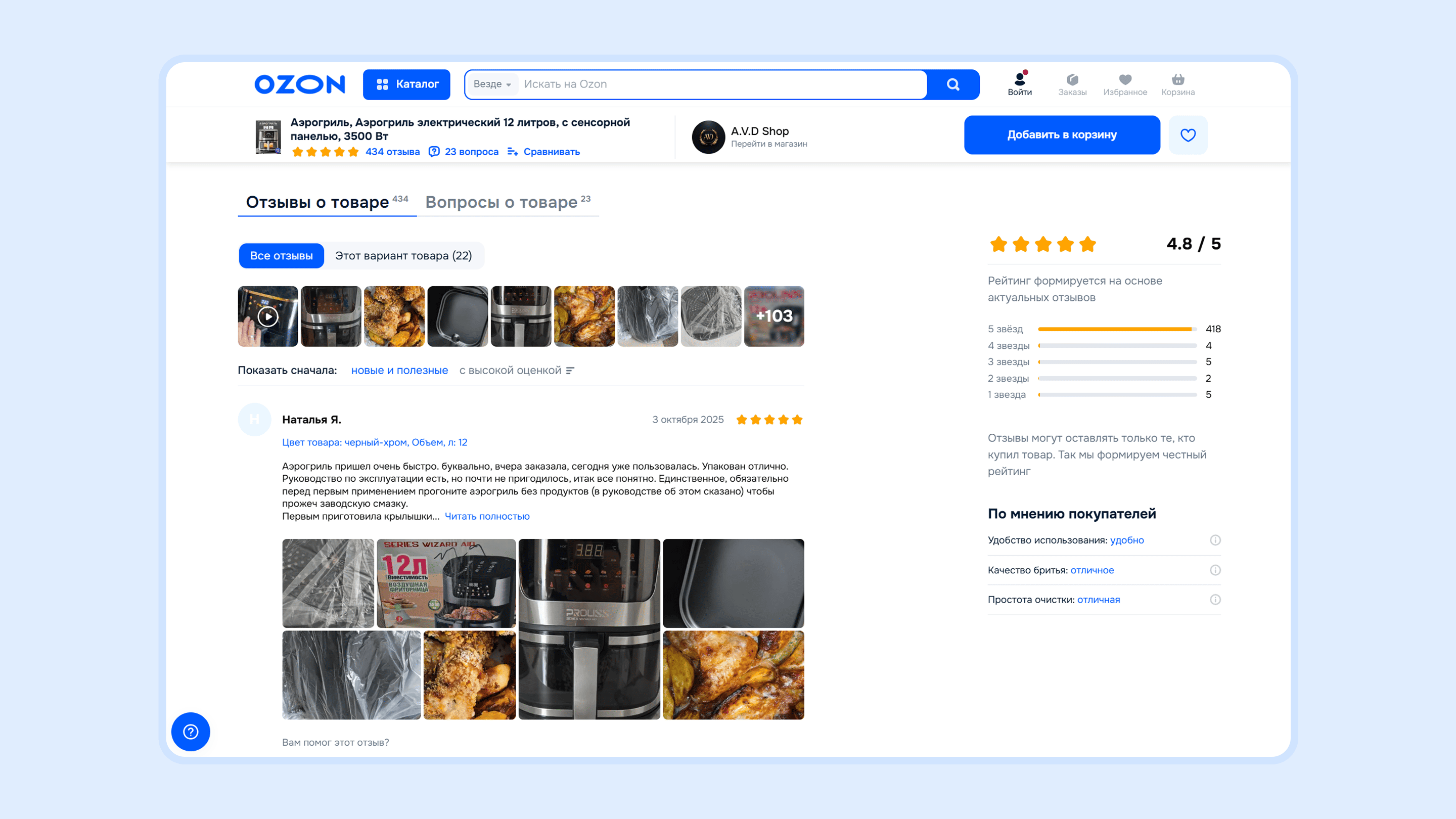 Разделы с отзывами, фотографиями и видео покупателей, вопросами и ответами помогают снять возражения, изучить реальный опыт и ускорить принятие решений. Добавьте сортировку по типам отзывов — последние, негативные и положительные комментарии.