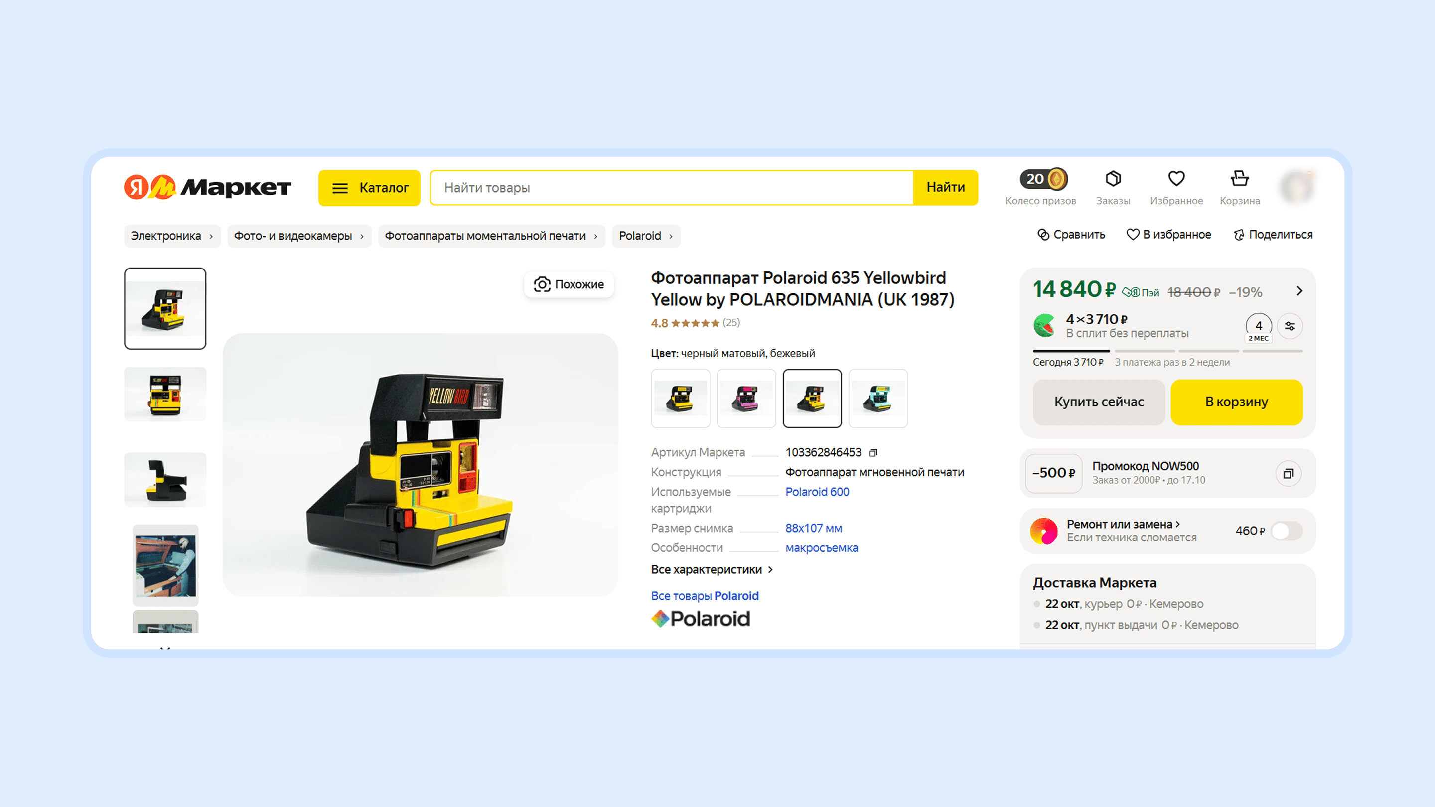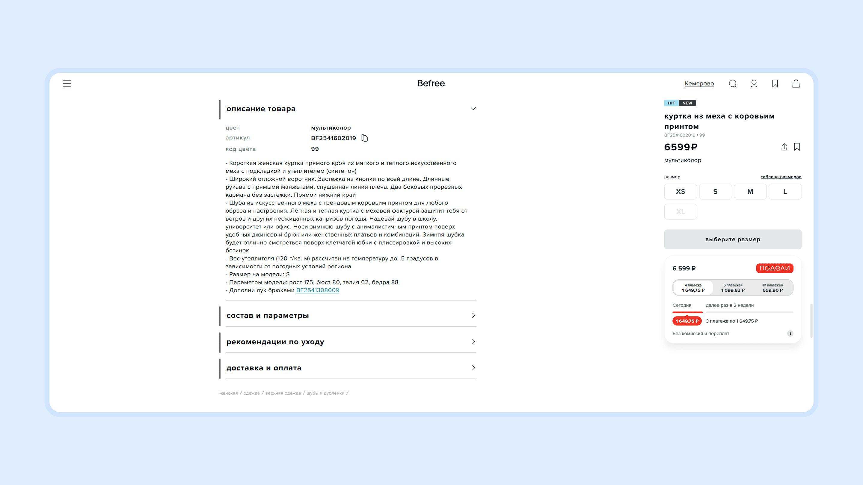 Выбор цвета и размера на первом экране и в один клик. При переключении должны обновляться фотографии, стоимость и наличие. Так снижается количество возвратов.