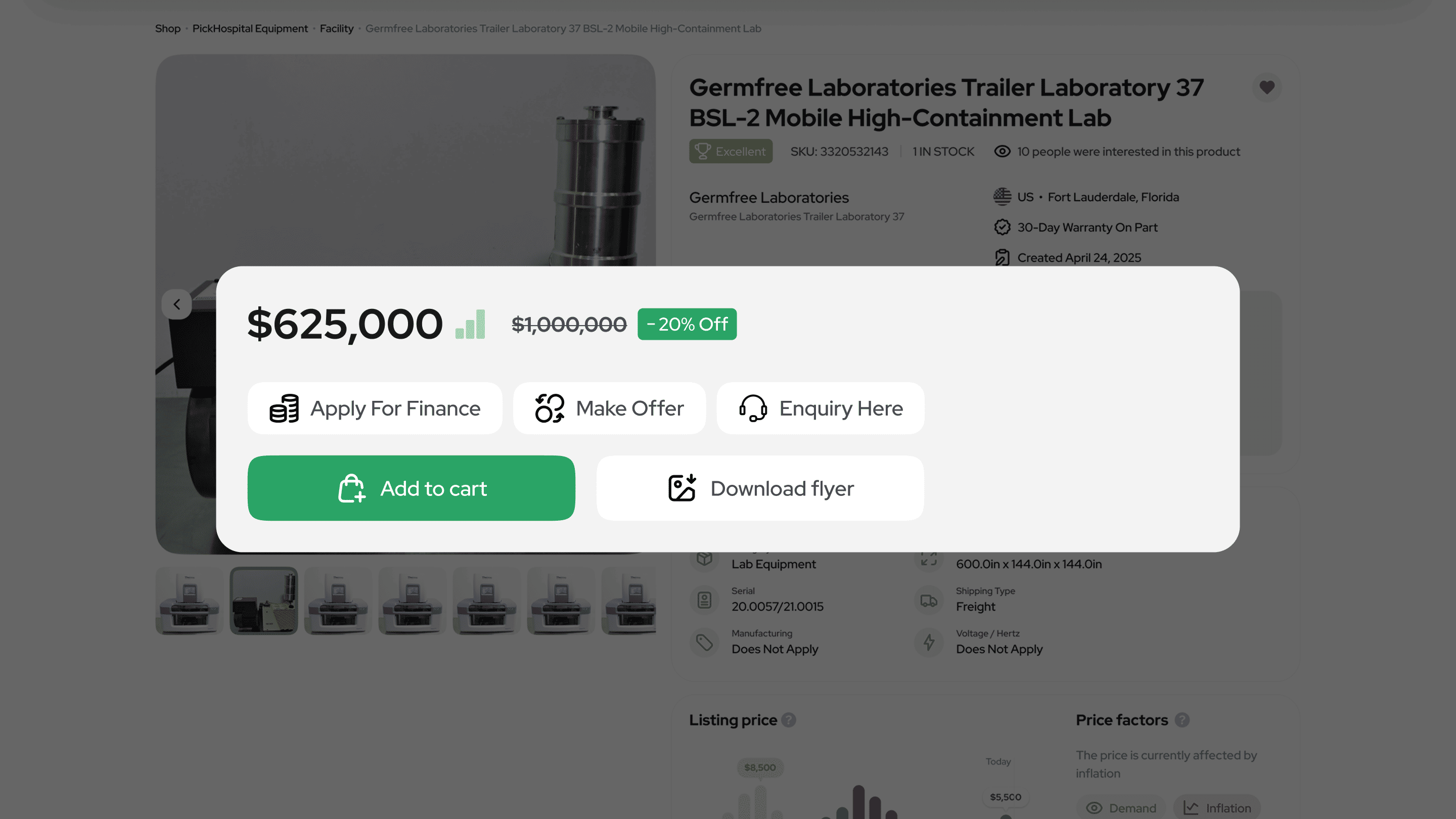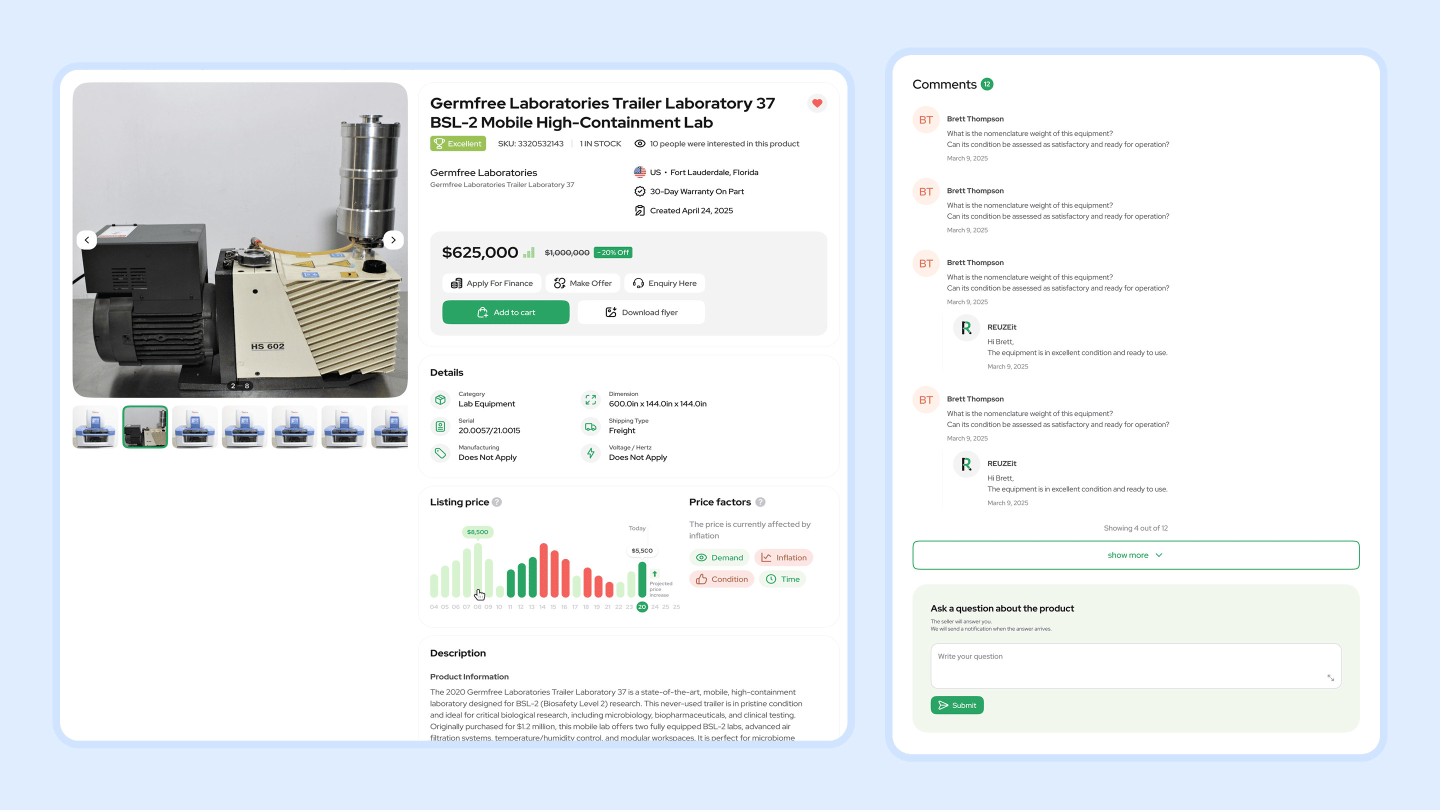 В кейсе для калифорнийского B2B-магазина наша команда добавила в карточку несколько блоков для согласования стоимости. Площадка помогает бизнесу торговать новым и б/у оборудованием, а также сдавать его в аренду. Поэтому пользователь может согласиться на указанную цену или предложить свою и устроить торги, а также: