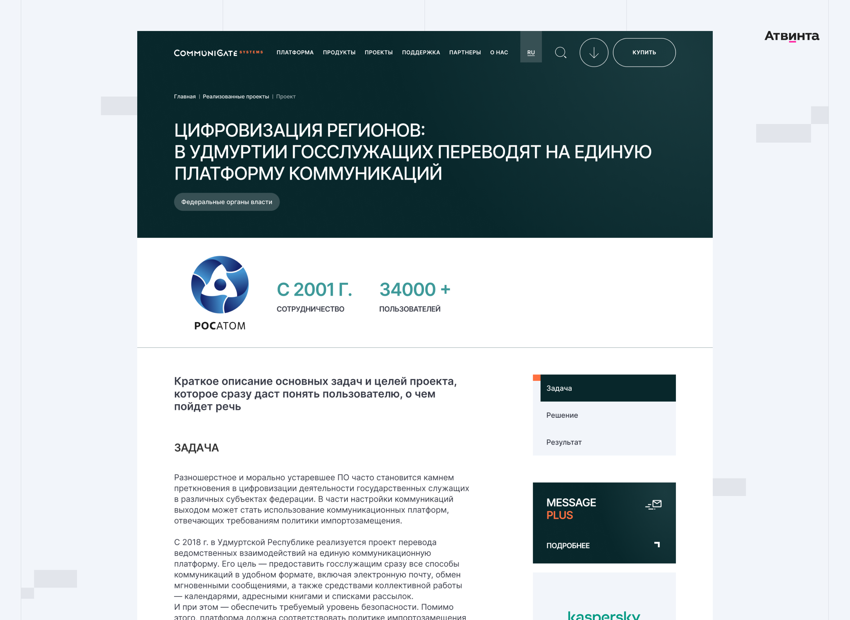 Кейсы и клиенты — сильная сторона Communigate. Разработкой компании пользуются «Газпром», «Росатом», РЖД, «Ростелеком» — это крупные игроки рынка, а «большие» имена всегда добавляют баллы в пользу компании. Мы посвятили отдельный раздел реализованным проектам, чтобы сделать акцент на экспертизе и получить больше доверия к софту.