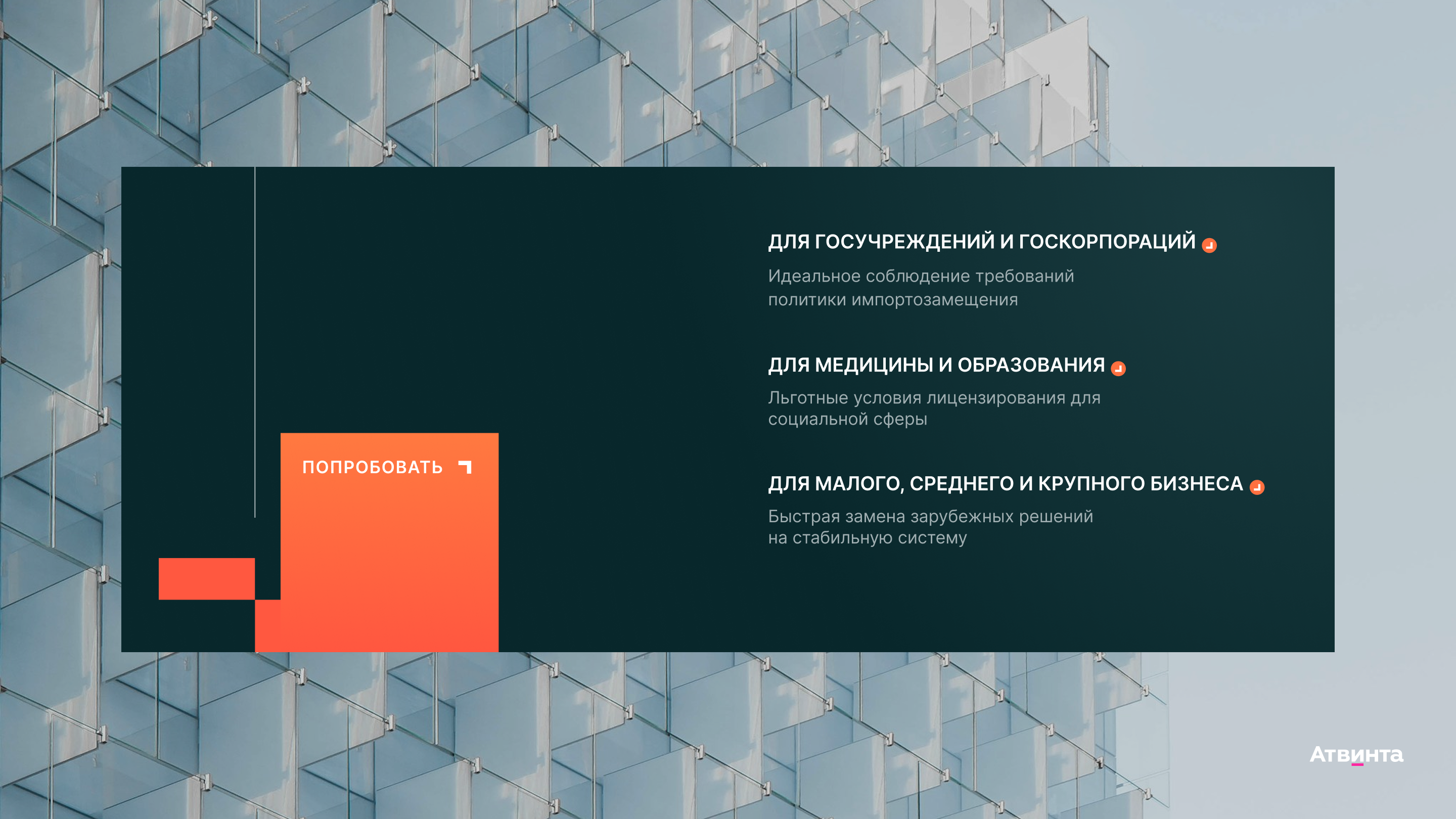 В хедере сайта закреплена кнопка «Купить» и кнопка скачивания с тестовыми доступами и пробной версией софта. Они всегда под рукой, чтобы пользователь в любой момент мог перейти к целевому действию.