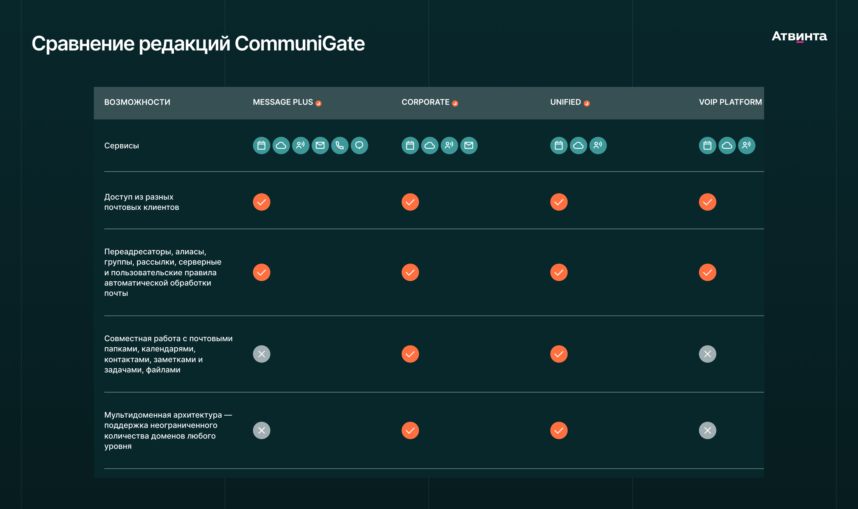 В разделе редакций добавили батл-карту с основными отличиями версий продукта. Инструмент позволяет быстро сравнить вариации Communigate. Такая шпаргалка пригодится клиентам и дистрибьюторам, которые продают систему.