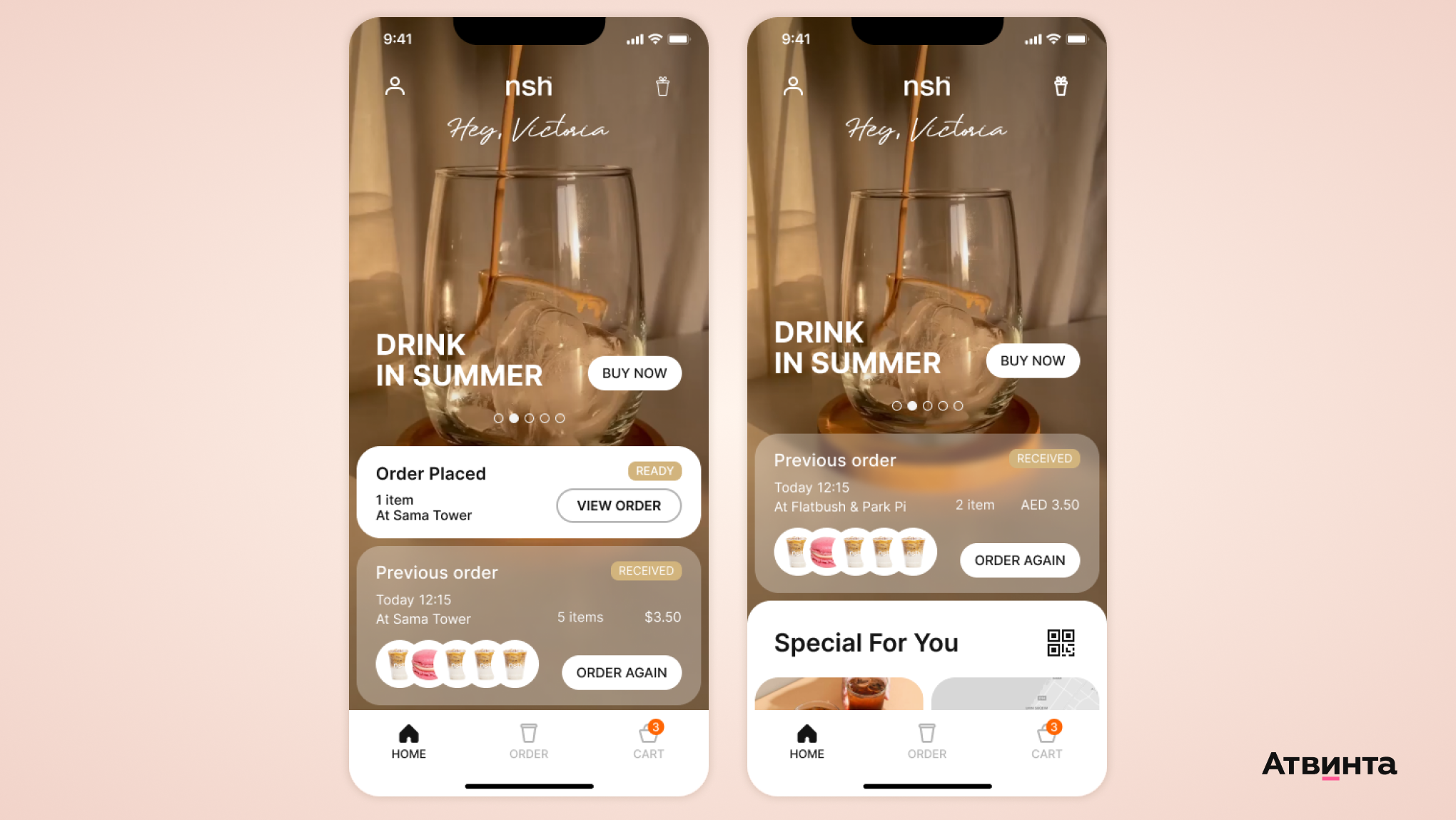 После получения напитка на домашнем экране будет отображаться выполненный заказ и товары, которые в нем были. Для удобства мы добавили функцию повторения покупки.