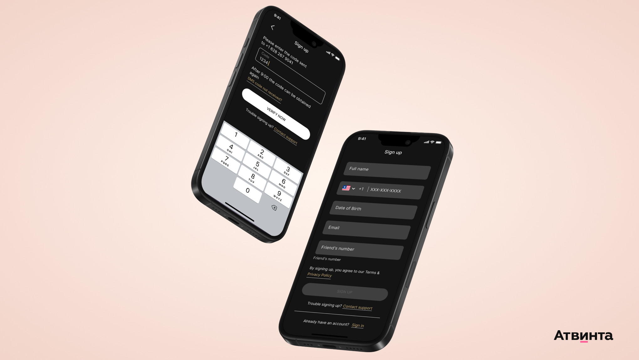 Для прохождения регистрации пользователю нужно подтвердить свой номер телефона. Он может выбрать любую страну, заполнить данные, получить код верификации — и перейти к основному функционалу.