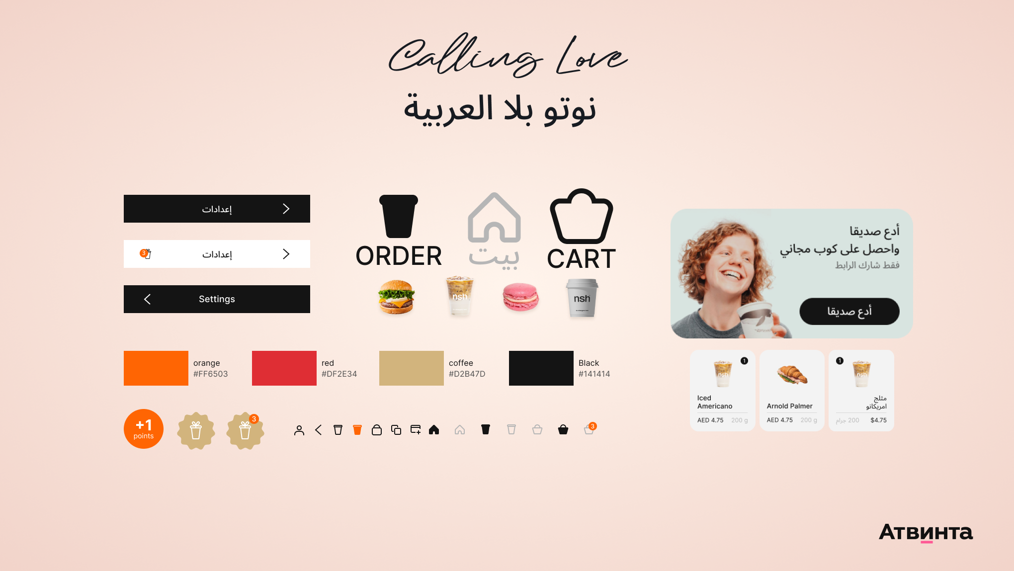 Также собрали UI kit с основными элементами приложения: цветовая гамма, шрифты, иконки, карточки товаров, лого и другие повторяющиеся блоки. Так как кофейня была стартапом, было важно учесть, что в будущем понадобятся доработки интерфейса. Эти артефакты нужно было передать заказчику.