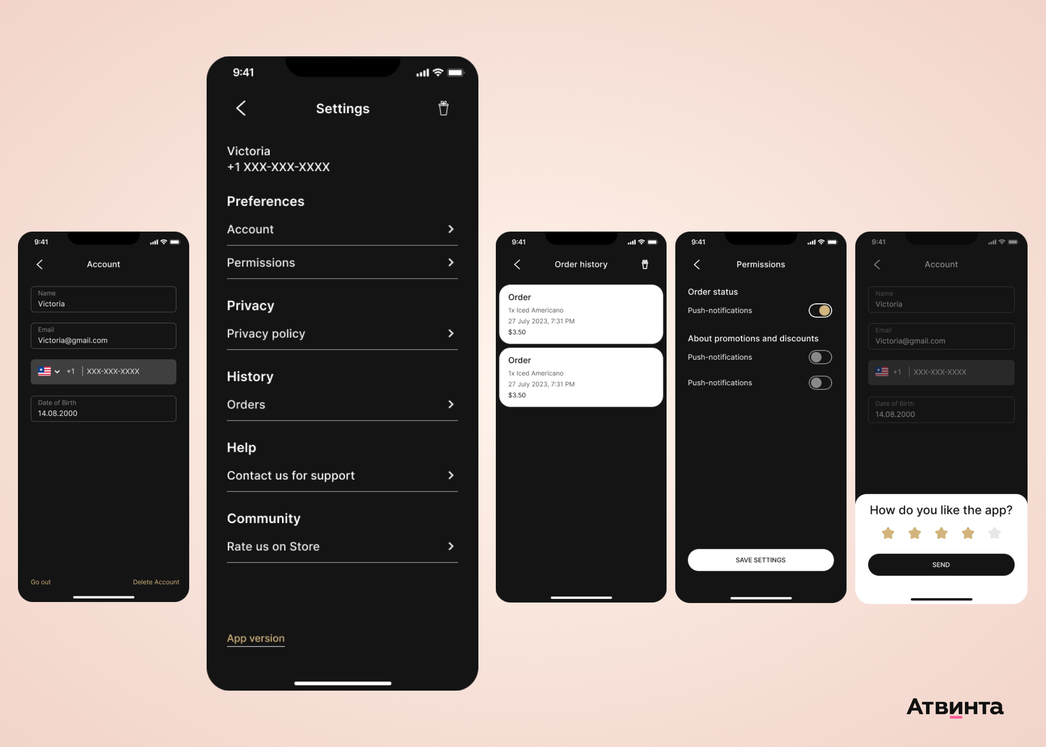 В настройках пользователь может поменять свои данные, посмотреть историю заказов, выбрать параметры уведомлений, оценить приложение и обратиться в техподдержку. Простое управление и возможность быстро обратиться за помощью укрепляет доверие к бренду и показывает уровень сервиса.