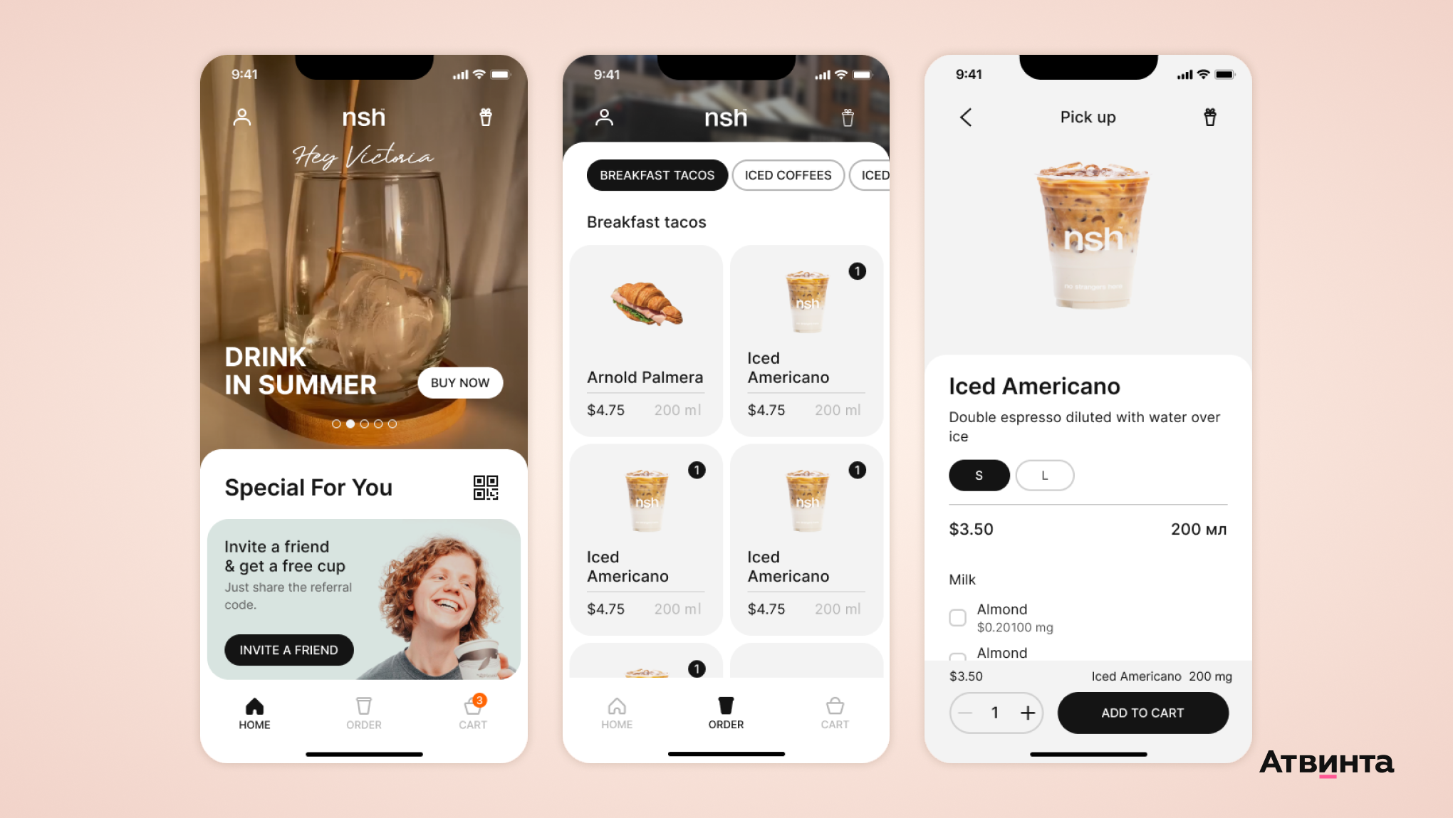Когда пользователь открывает карточку — он выбирает объем напитка и добавки к нему: сиропы, сахар или мед, растительное или коровье молоко и так далее. Затем добавляет кофе и переходит в корзину. Клиент может сделать заказ, но оплата происходит непосредственно в кофейне во время выдачи товара.