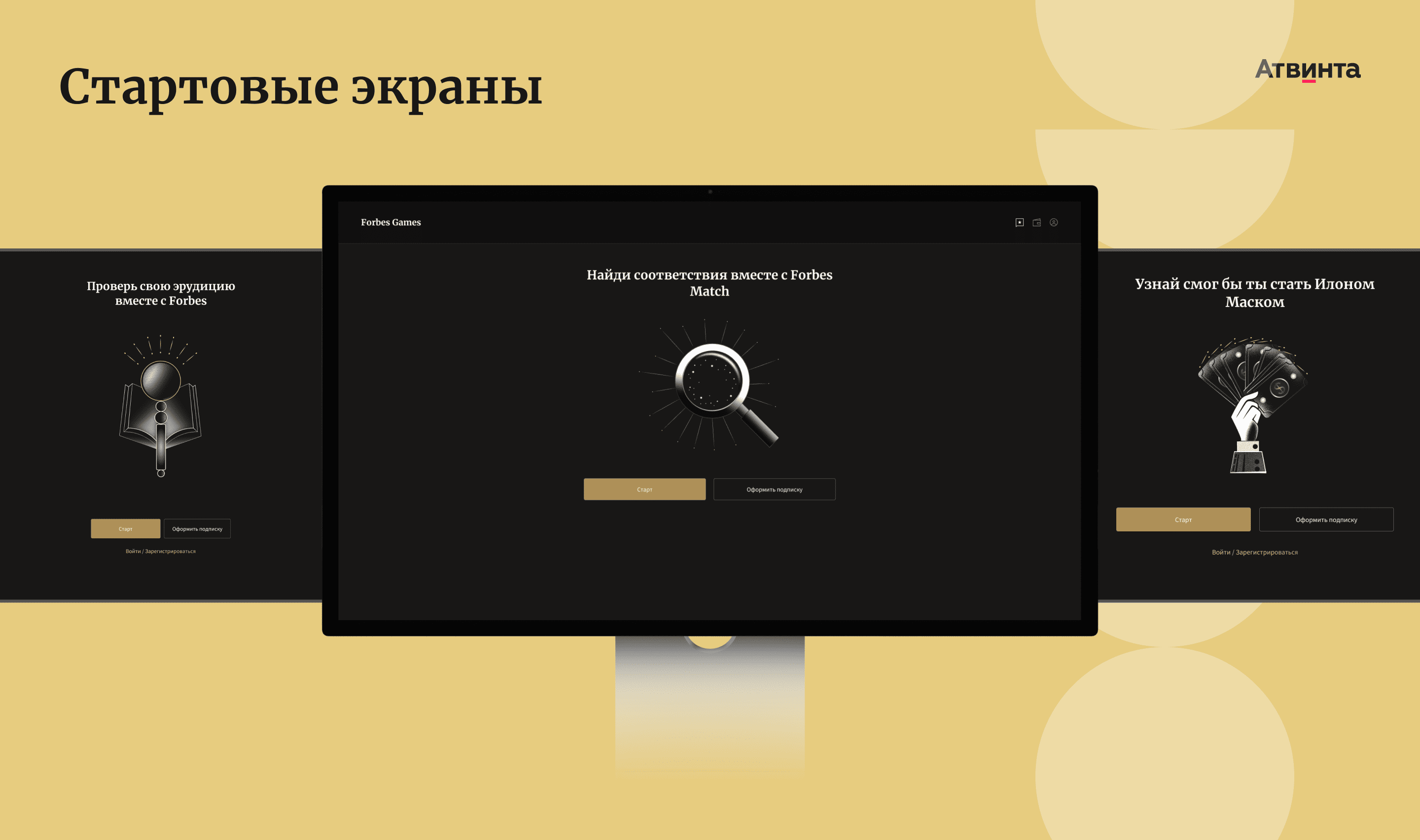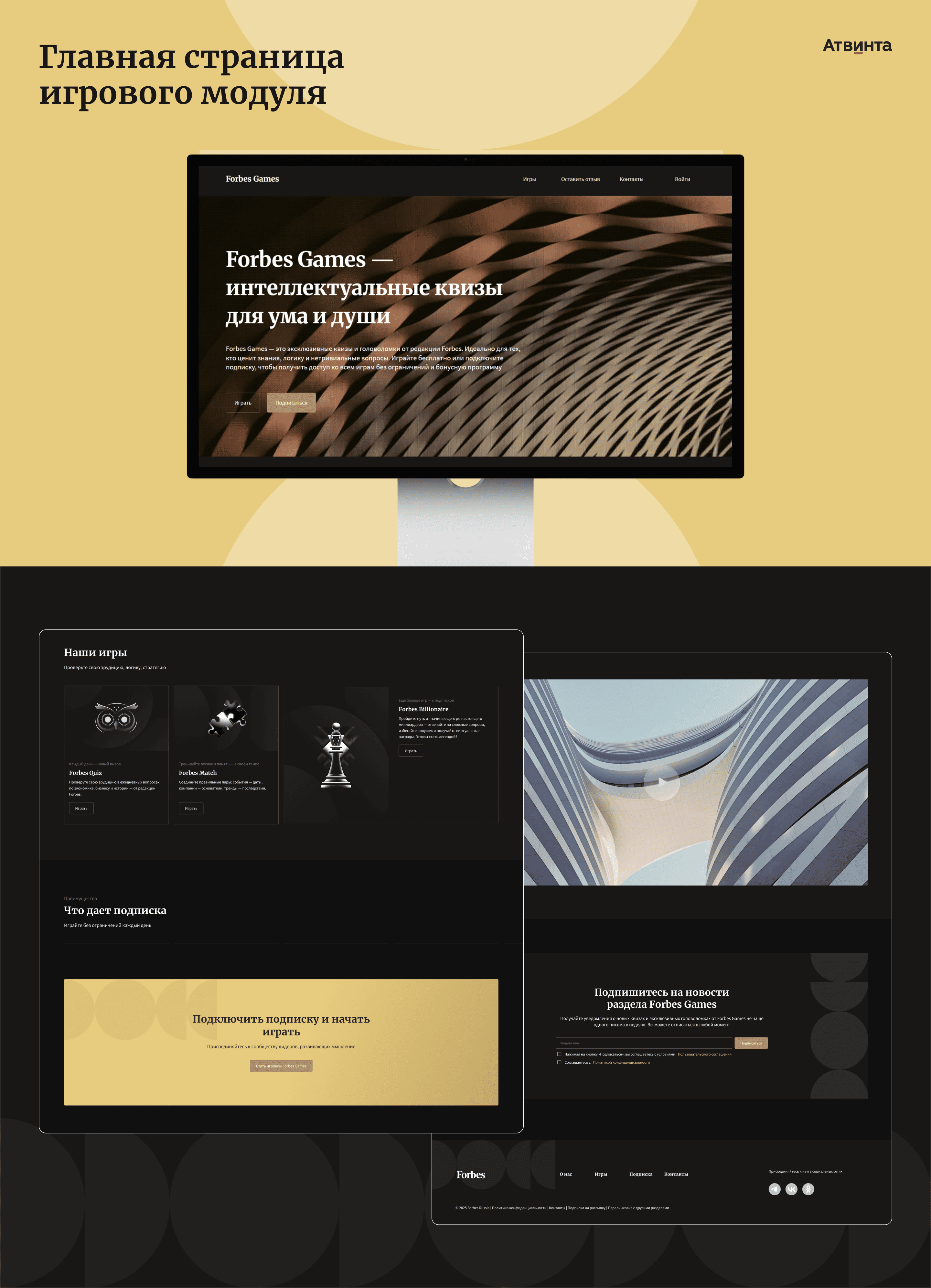 Мы опирались на визуальный стиль Forbes: темный фон, черно-белая графика с золотыми акцентами, крупные заголовки и короткие подписи. Forbes Games получился нативным разделом сайта с карточками игр.