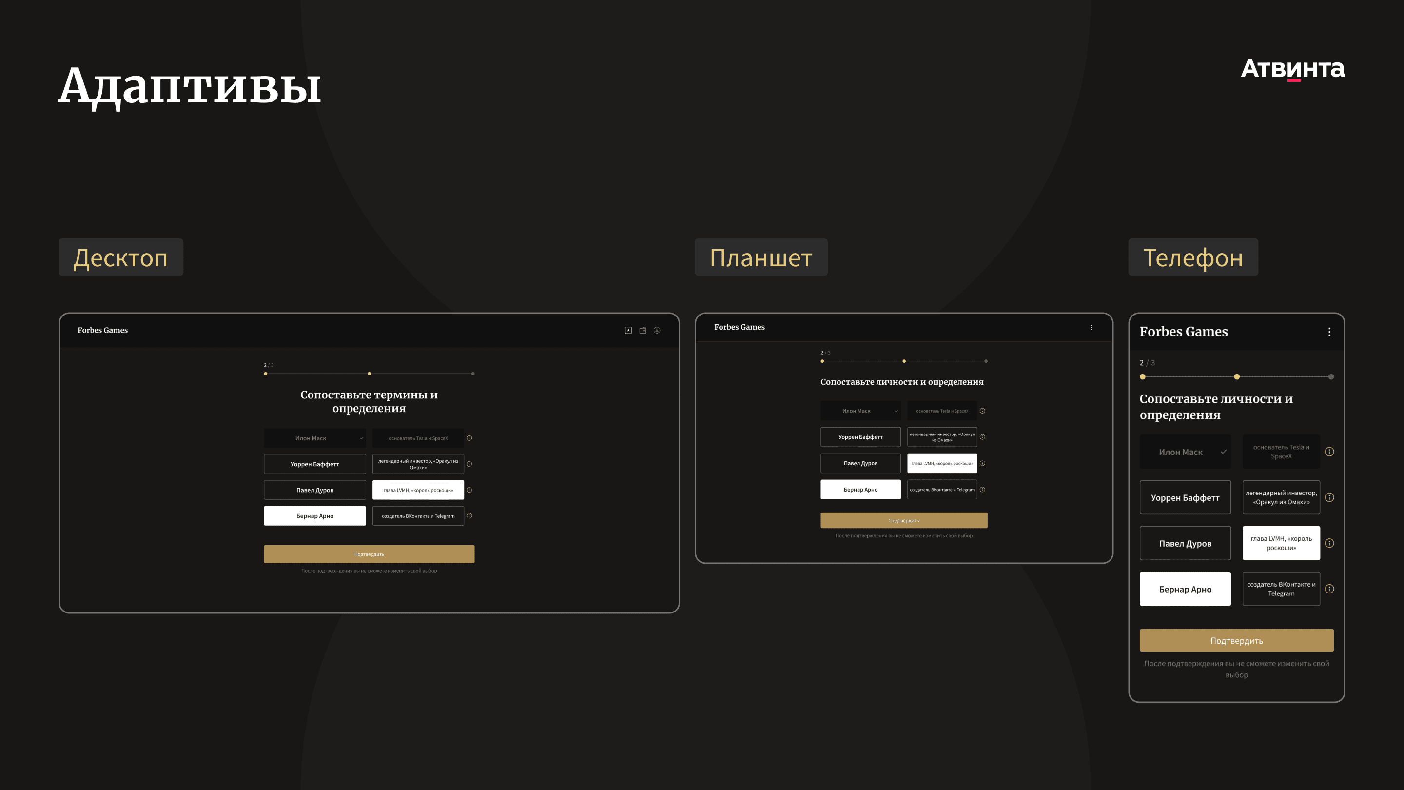 Все макеты проектировали в адаптиве, чтобы пользователи могли с любых устройств проходить игры, читать статьи Forbes и легко переключаться между разделами.