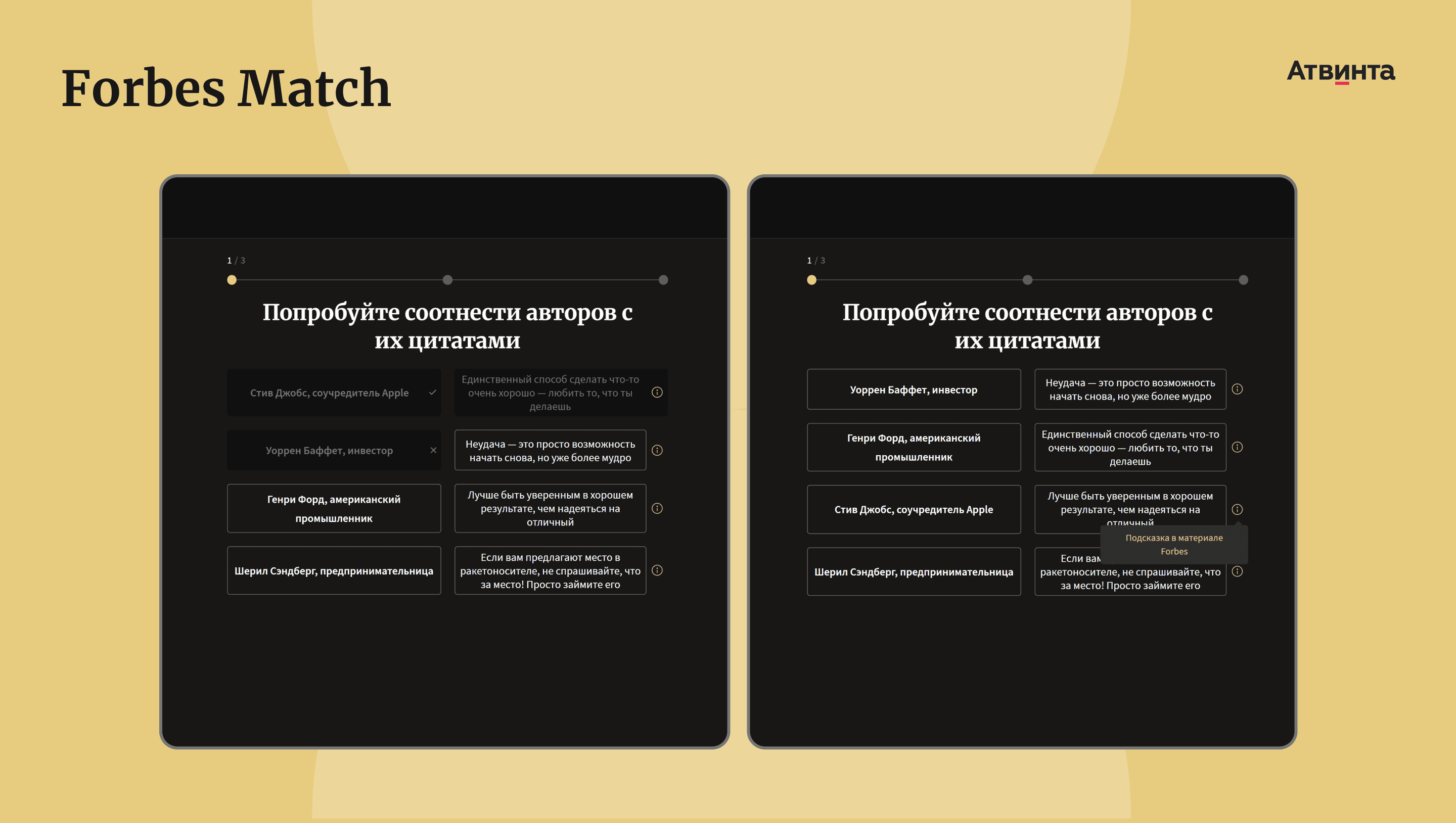 Forbes Match — это игра на поиск соответствий. Игра помогает читателям глубже погружаться в материалы Forbes. Для редакции это инструмент, который позволяет обучать пользователей и выстраивать последовательный путь от простых игр к сложным статьям.