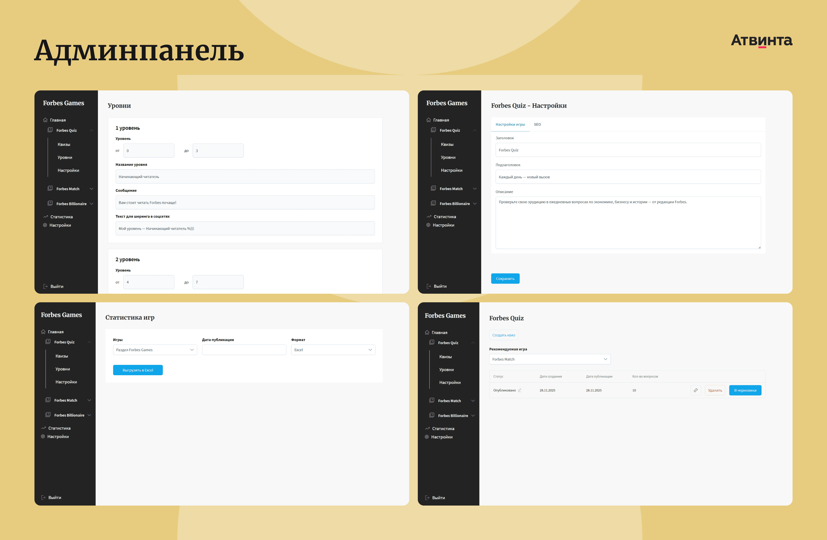 Создали админпанель для редакции Forbes — разделы для управления играми, подсказками, уровнями и текстами, а также блок с выгрузкой отзывов.