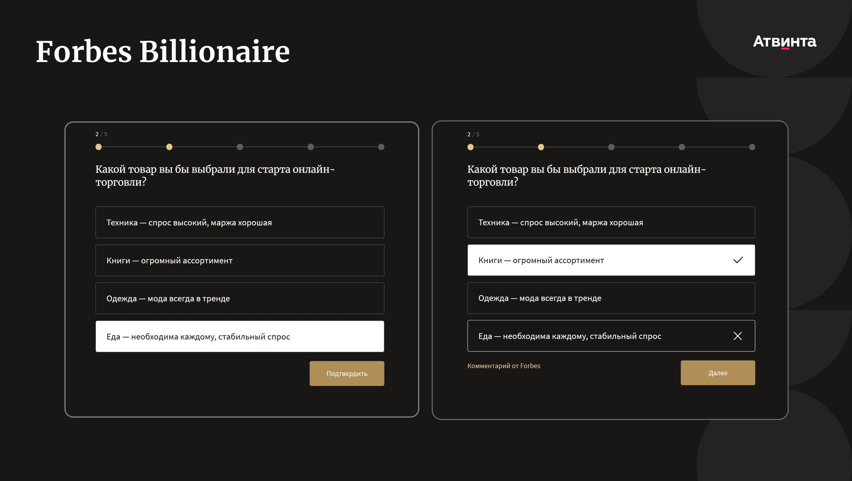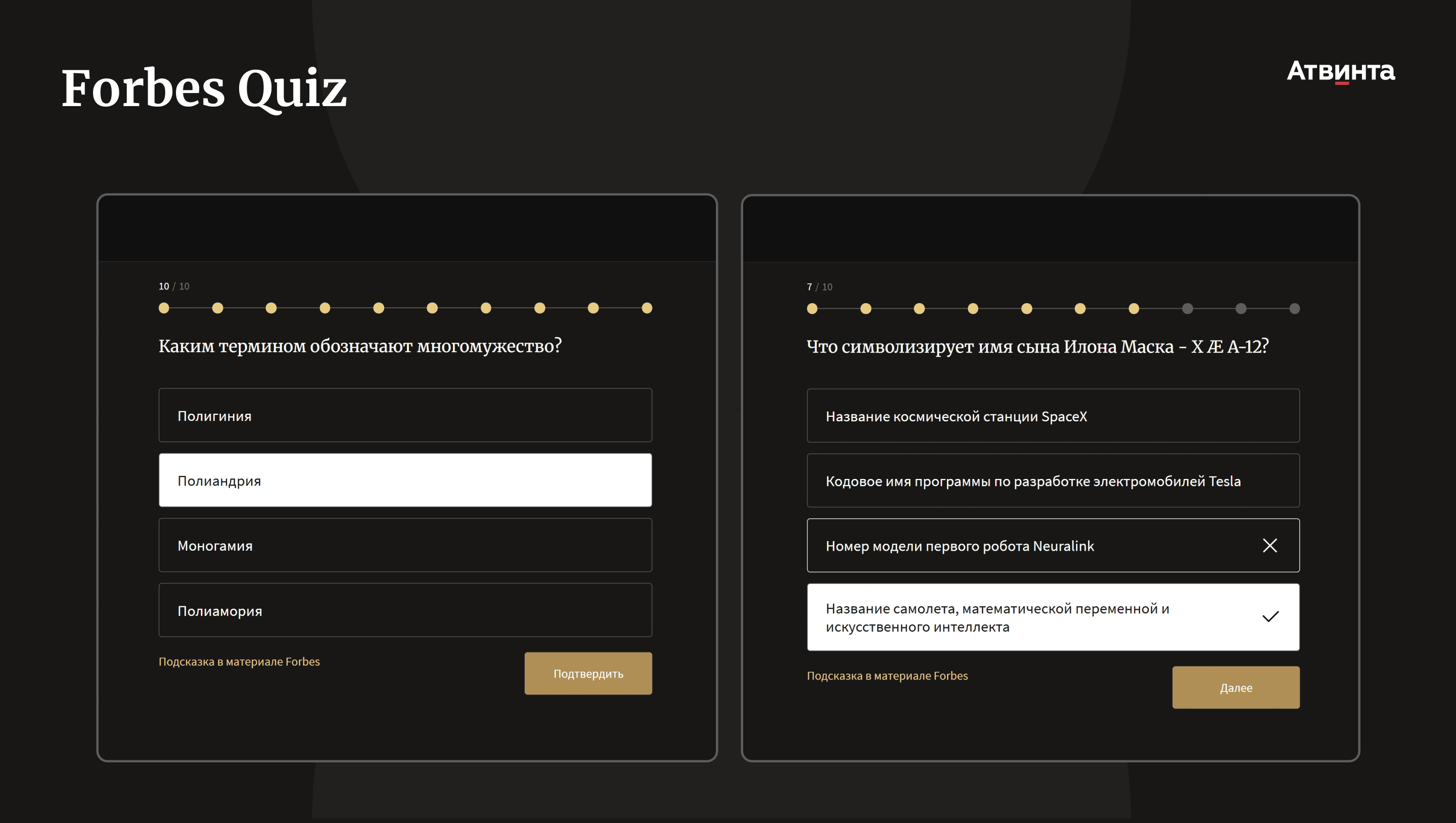 Forbes Quiz состоит из десяти вопросов с прогрессом по шагам и подсказками. После каждого ответа пользователь видит правильный вариант и комментарий по данной теме.