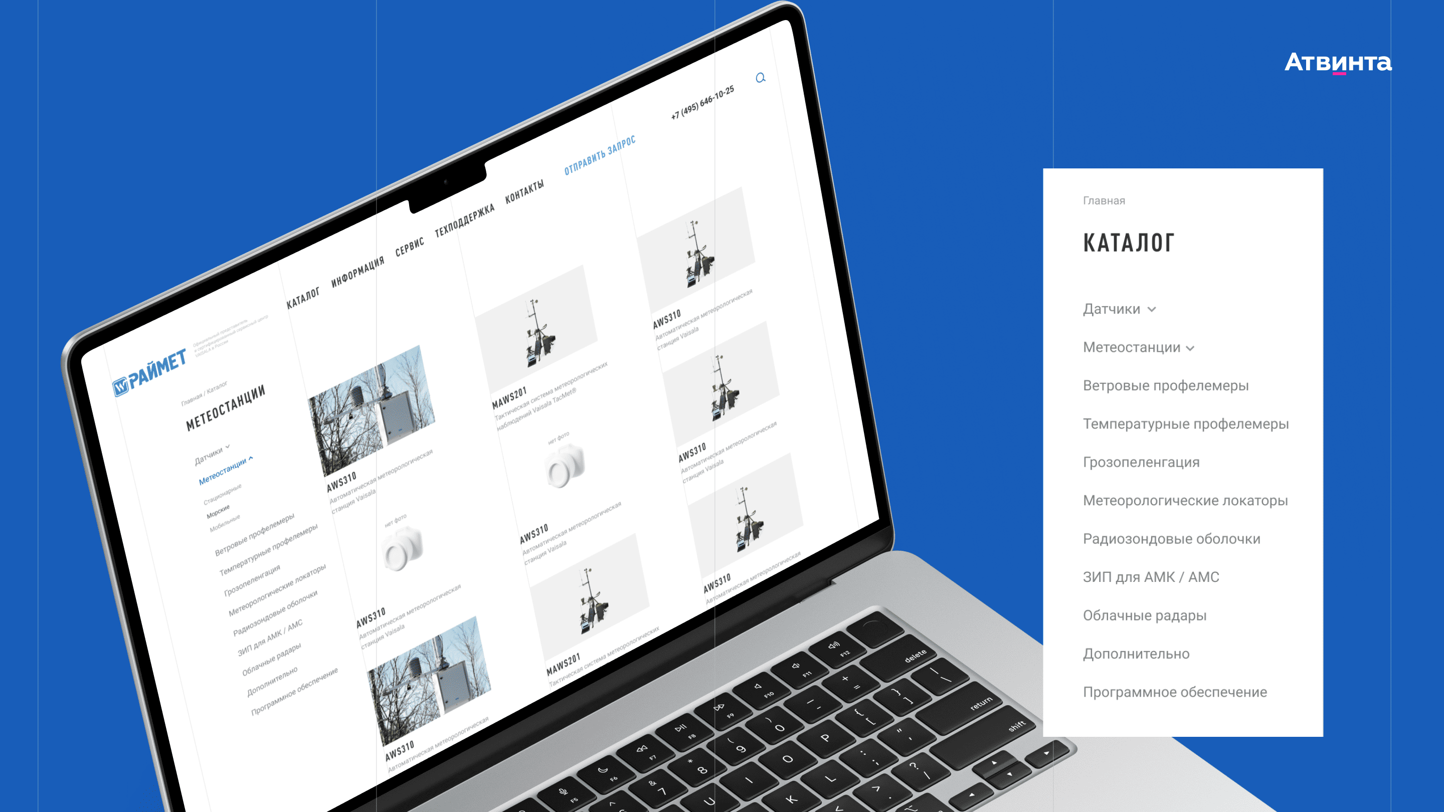 Основной акцент сделан на анимированные 3D-модели метеорологического оборудования. Этим сайт визуально удивляет и вовлекает пользователя — хочется пролистать все слайды и посмотреть каждую из 11 сборок.
