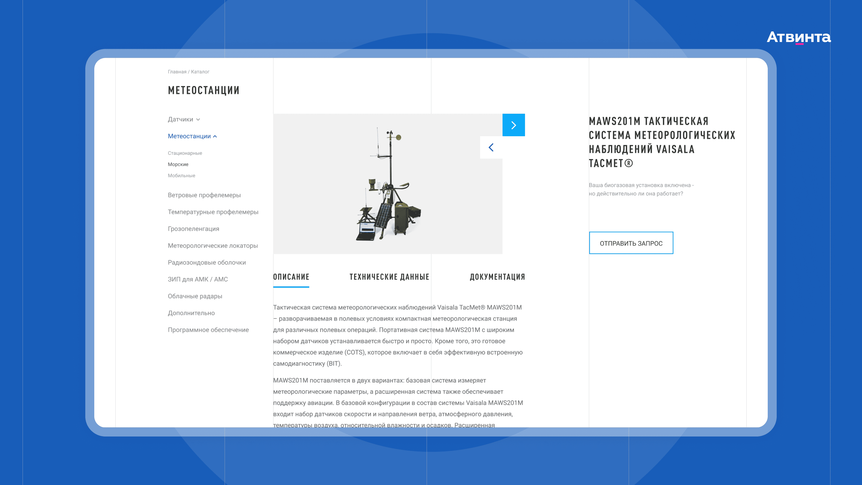 Задача метеорологического оборудования — измерять. А значит, ему понадобится описание, технические данные и прилагающаяся документация. По этим категориям мы и структурировали информацию о приборах в карточке.