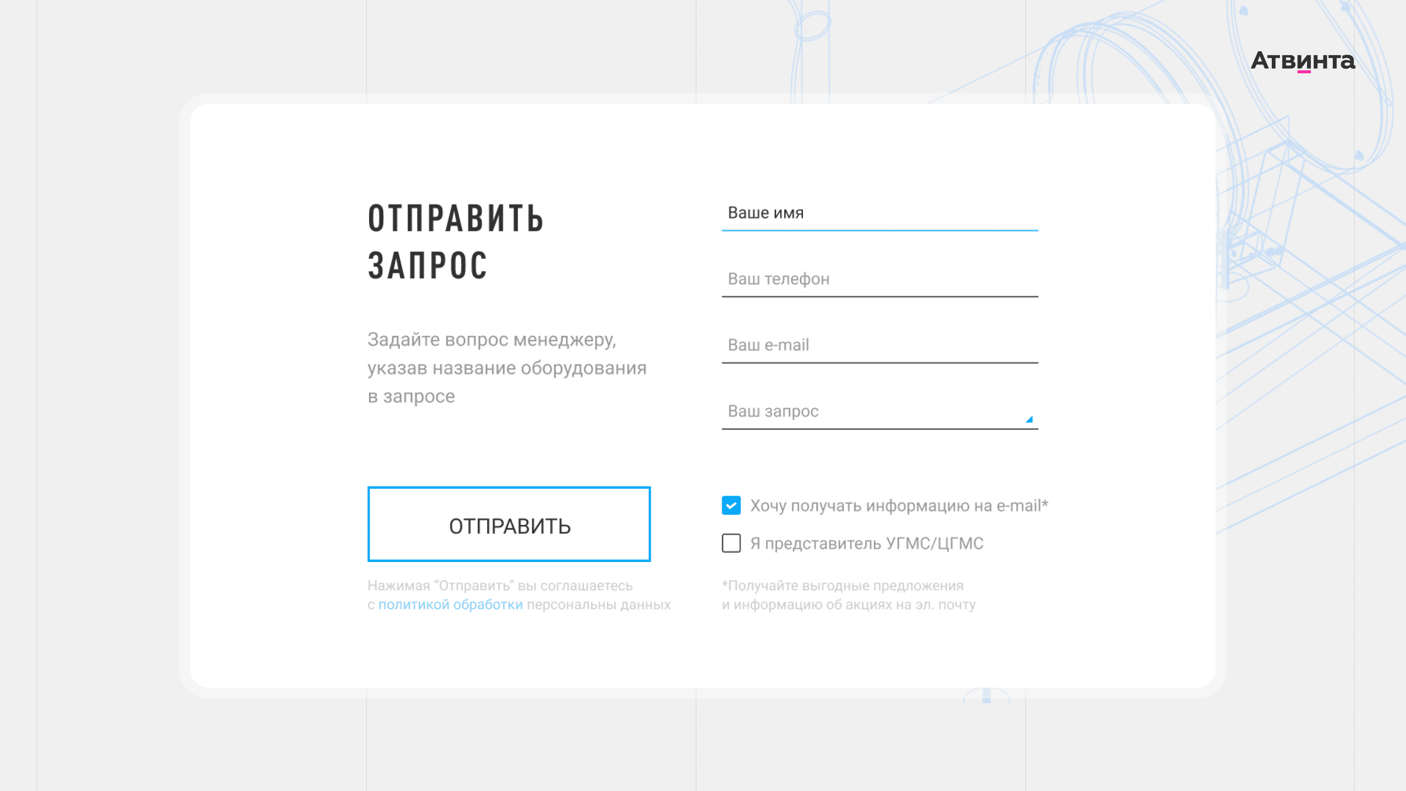 Заказы в компании оформляют через менеджера, поэтому корзина на этом сайте не нужна. Вместо этого реализовали кнопку «Отправить запрос» в карточках товара. Она перекидывает на форму заявки, с которой далее работают менеджеры. Также на оформление заявки можно перейти сразу с главной страницы, нажав на ссылку в верхней строке.